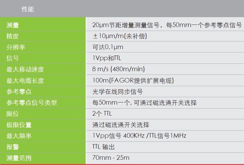 產品介紹開放式光柵尺|敞開式數顯尺 EXA FAGOR EXA型開放式數顯尺的特點:粘貼式數顯尺;6mm寬的鋼帶;用于小空間安裝;測量長度可達16m;采用抗腐蝕、反射性的不銹鋼帶。 開放式數顯尺是發格的新產品,他主要是因產業升級應市場需求的而生的尺子。它的精度可達±5μ/m甚至±2μ/m.發格開放式光柵尺主要應用于以下行業:三坐標測量機、半導體制造設備、電子裝配設備、光學檢測設備、印刷線路板掃描機、晶片切割和處理設備、平板印刷機、平板顯示器加工設備、直線電機。 這些行業都有一個特點就是工作無塵,這些機床的工作環境是無塵或者是少塵的,故無需擔心空氣染導致光柵的精度降低。