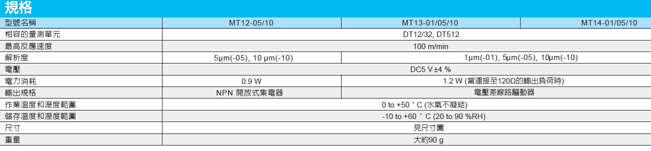 產品特點: MT12/MT13/MT14 MT12/13: For connection to counter MT14: Unterminated cable A/B-quadrature output by line driver [EIA-422 compliance] Power supply + 5 V DC