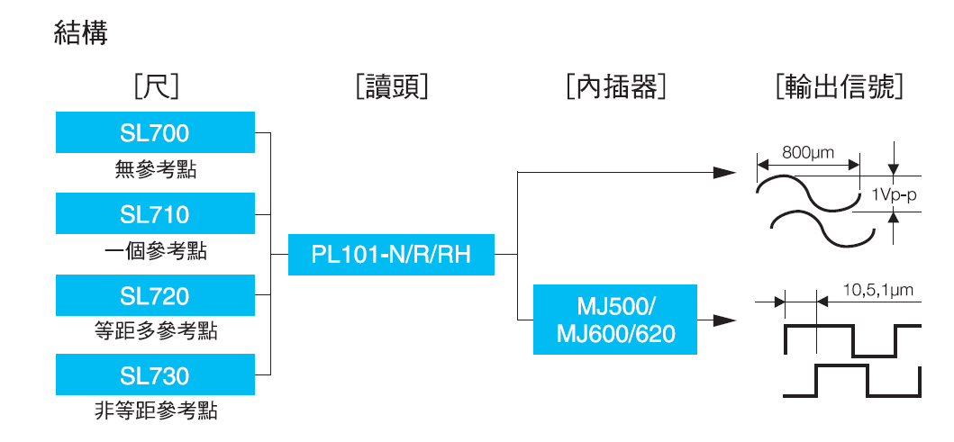 直線位移檢測,當連接PL101讀磁頭及MJ500/600/620系列轉換器時(兩者均單獨出售),