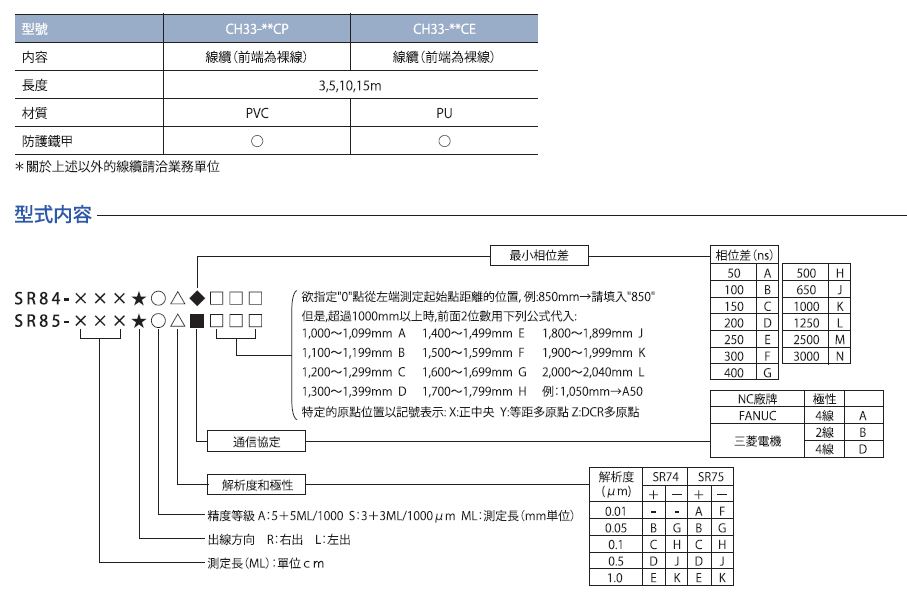產(chǎn)品介紹簡單介紹: 多原點(diǎn)絕對式磁尺SR84/SR85:適合需要高精度定位工作機(jī)械的高剛性中型磁性尺,輸出信號為A/B相/原點(diǎn)差動信號(符合EIA-422)及增量式串列雙方向信號(符合EIA-485);適用工控系統(tǒng):FANUC、三菱電機(jī)、松下 產(chǎn)品特性: 高剛性多原點(diǎn)絕對式磁尺SR84/SR85:適合需要高精度定位工作機(jī)械的高剛性中型磁性尺,輸出信號為A/B相/原點(diǎn)差動信號(符合EIA-422)及絕對式串列雙方向信號(符合EIA-485);精度±(1.5+1.5L/1000)μm,測量長度:140-3040mm,分辨率0.01μm,響應(yīng)速度200m/min,讀數(shù)頭摩擦力1N以下。適用工控系統(tǒng):FANUC、三菱電機(jī)、松下。